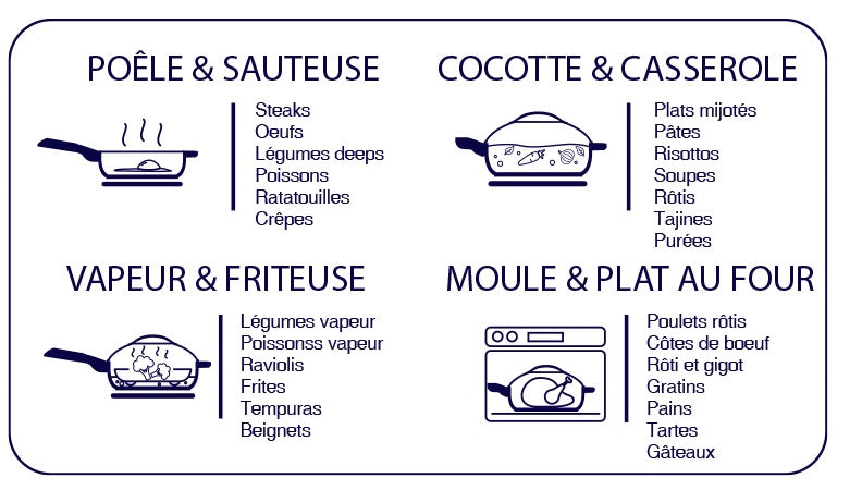 Oeufs au plat, poulets rôtis, légumes vapeur, blanquette de veau, frites, gratin, gâteaux, pizza... Tout est possible !