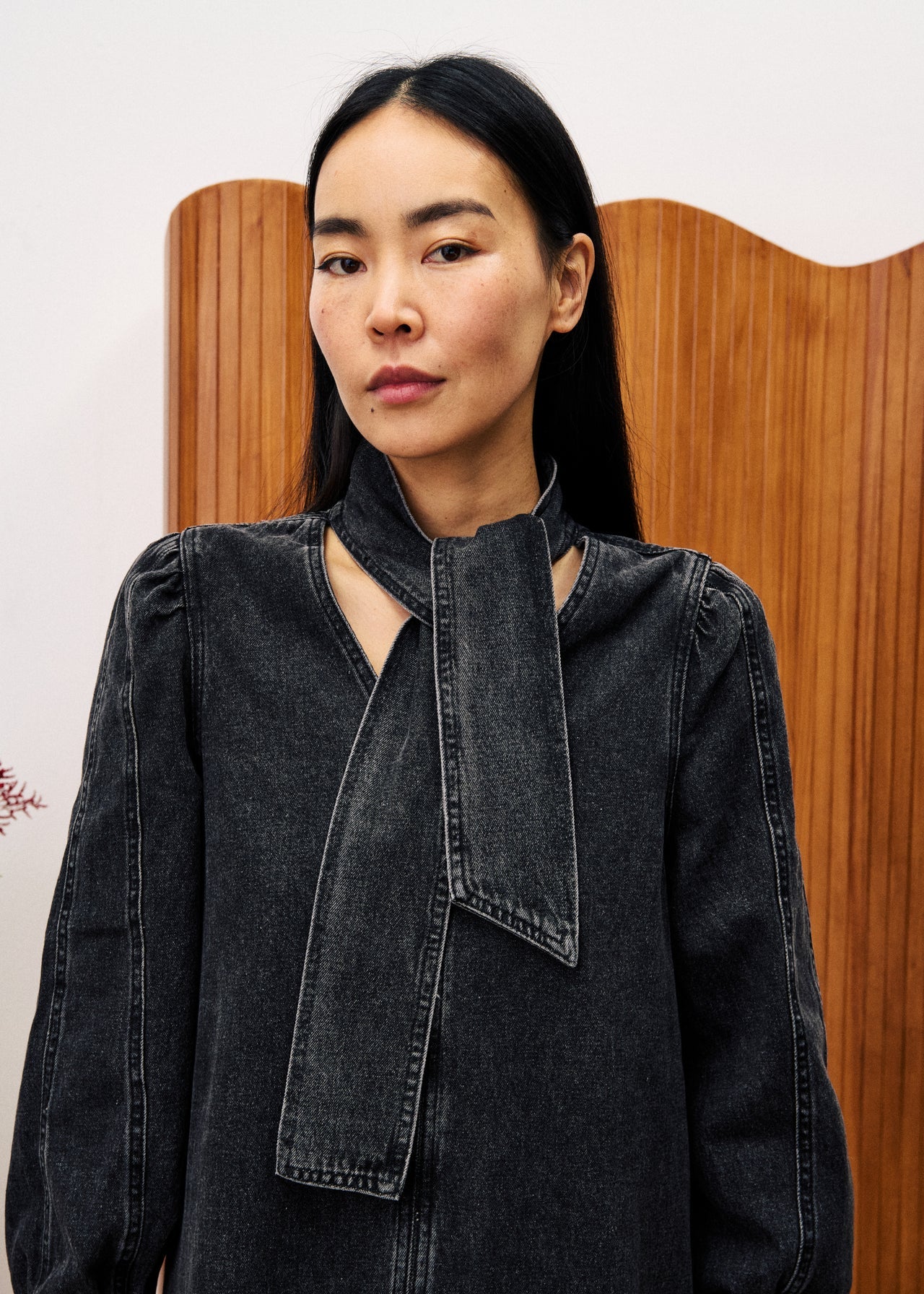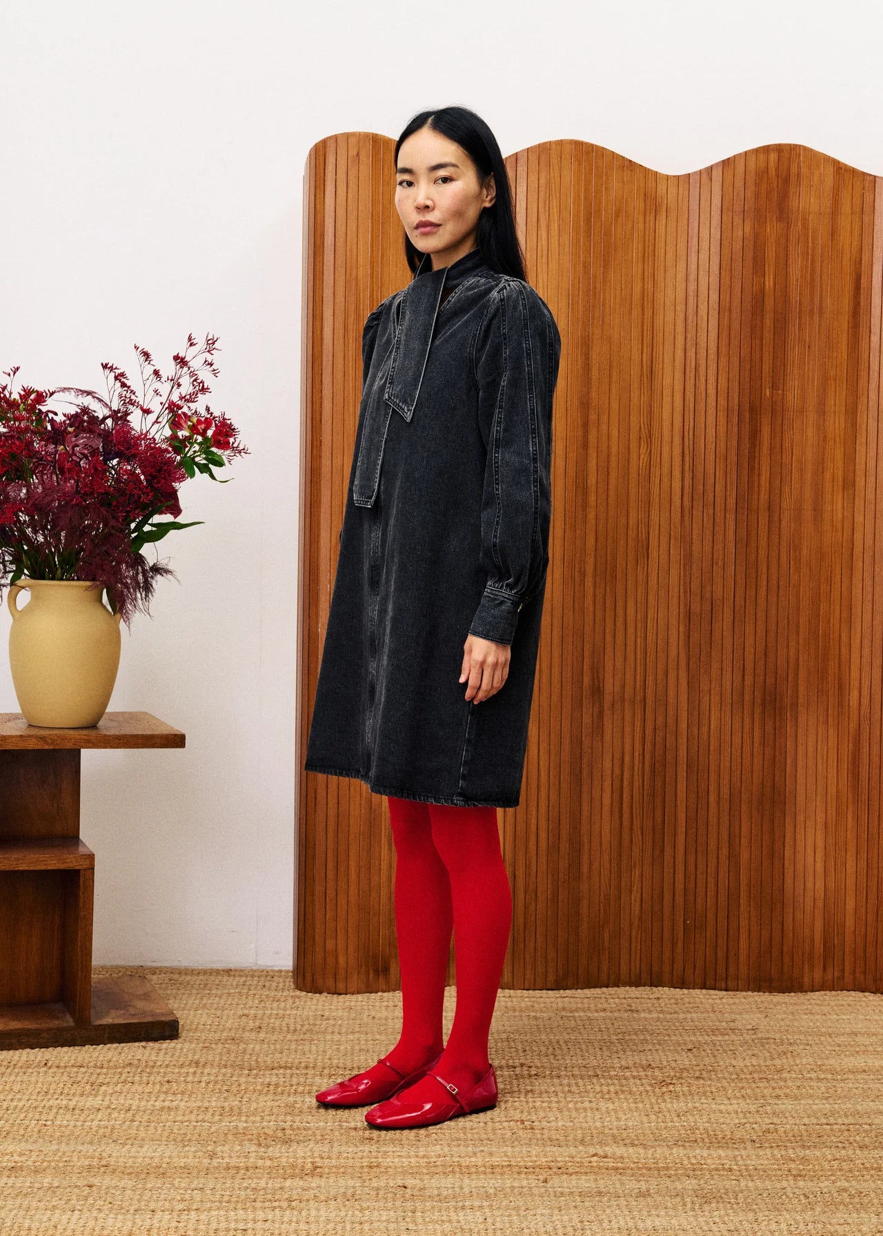 Robe courte en jean à col V, manches longues volumineuses et nœud réglable à la taille. Ce modèle taille grand, prenez une taille en dessous de votre taille habituelle.