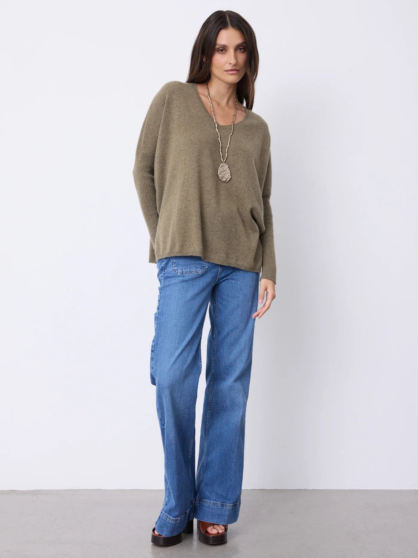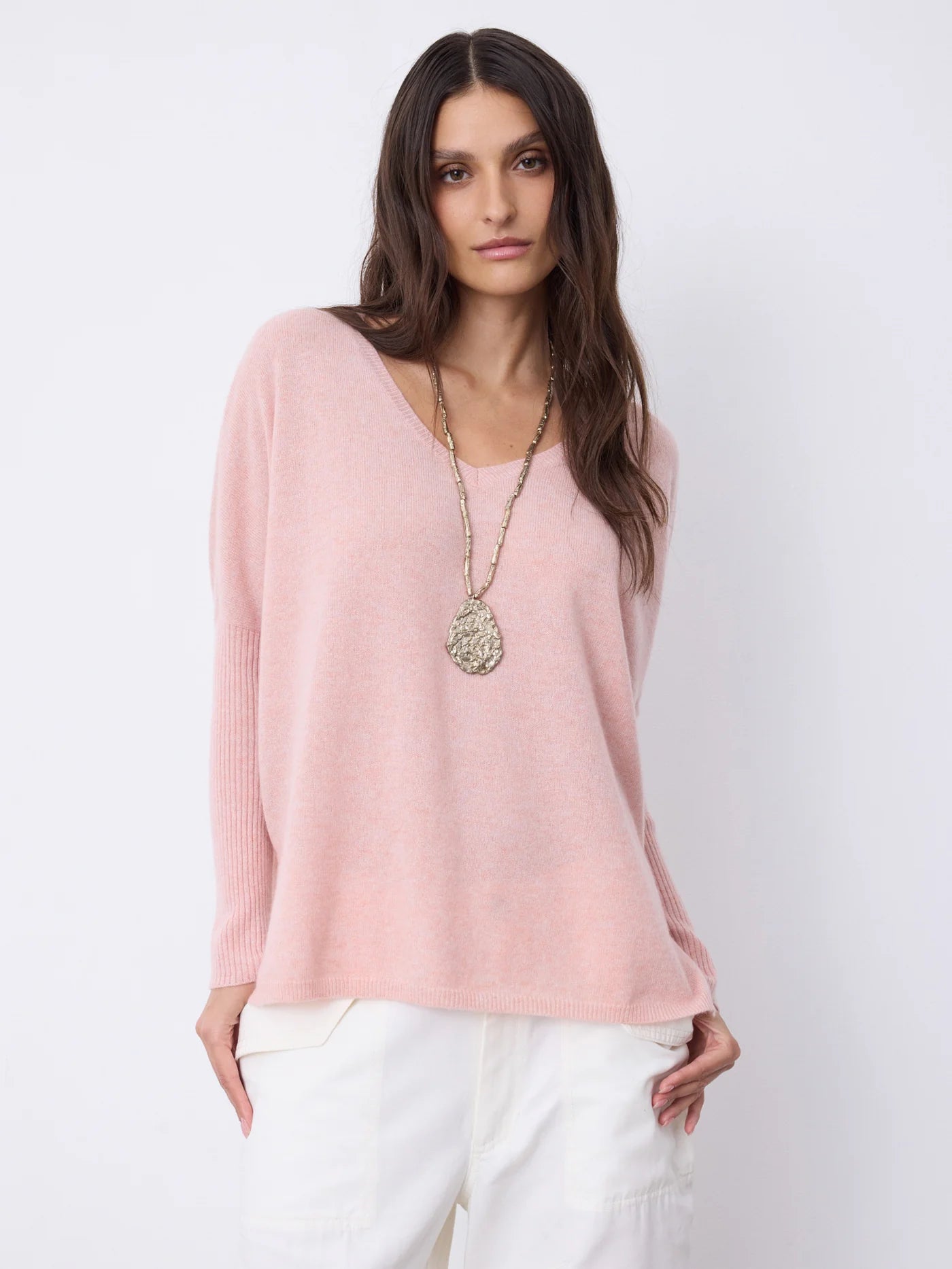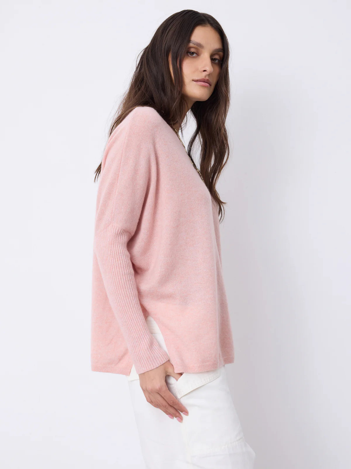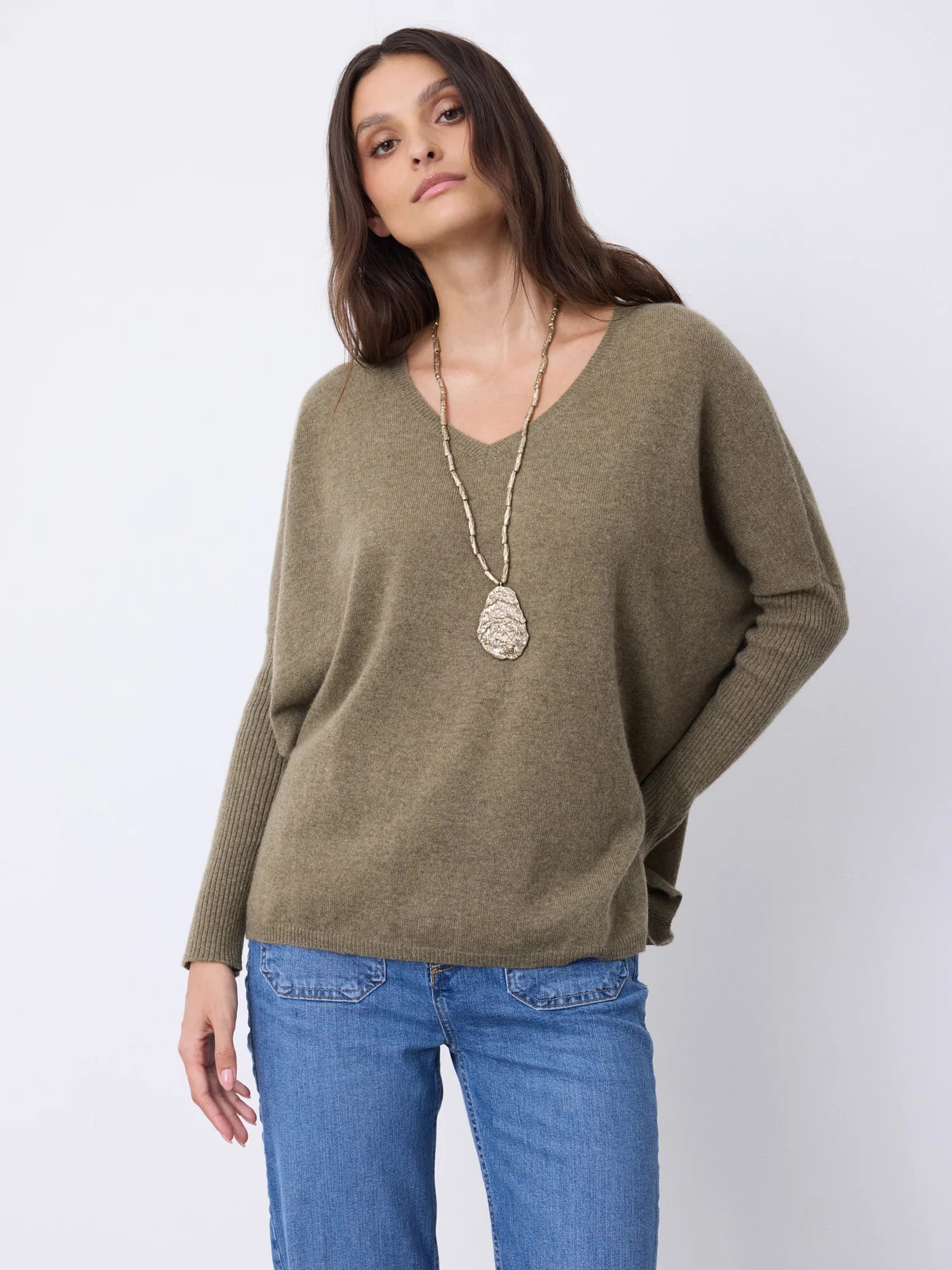 Pull pour femme à col V et manches longues chauve-souris, doté de manches côtelées, de fentes latérales et de finitions en bords-côtes, confectionné en cachemire 2 fils jauge 12, 100 % cachemire.