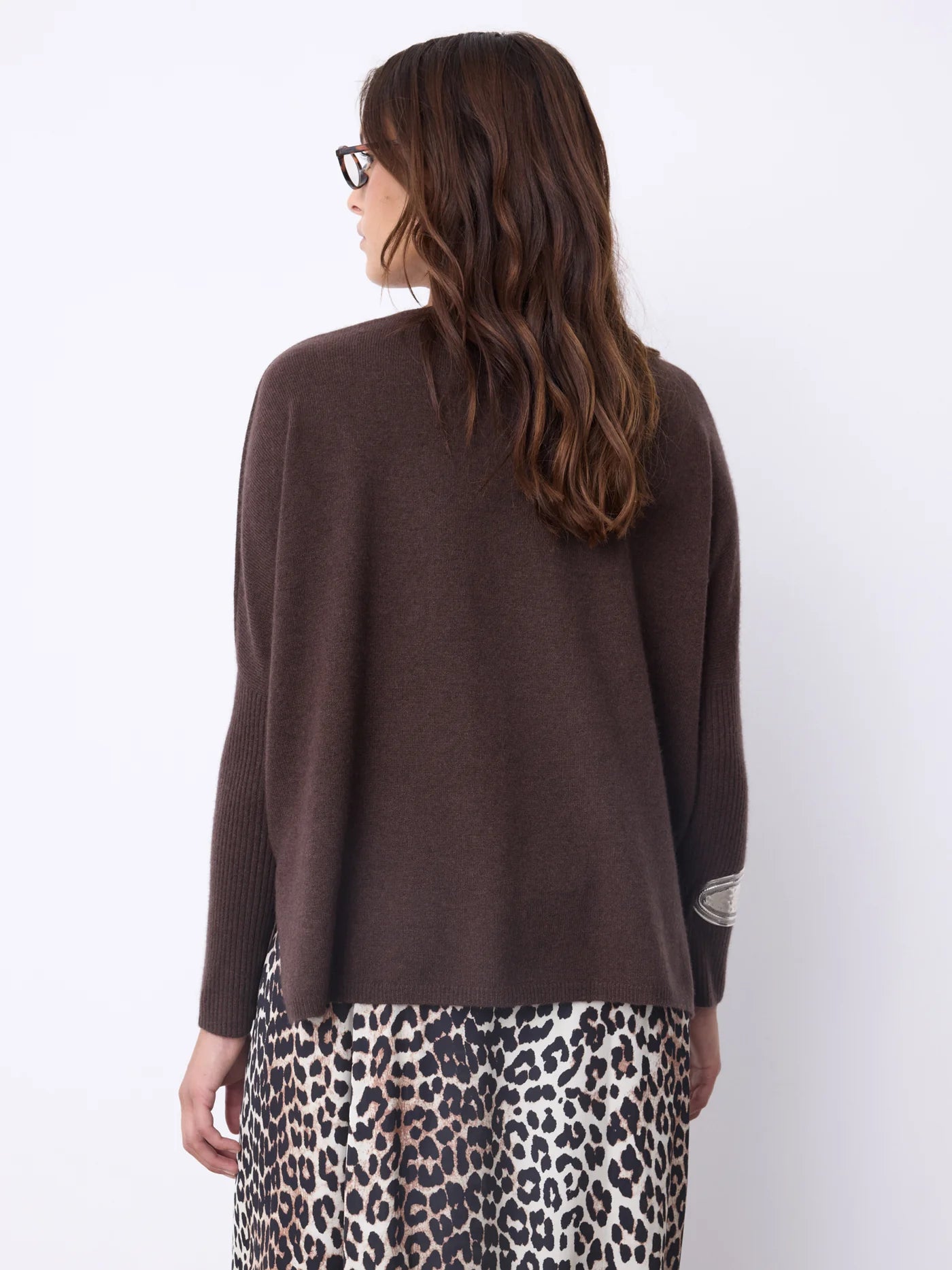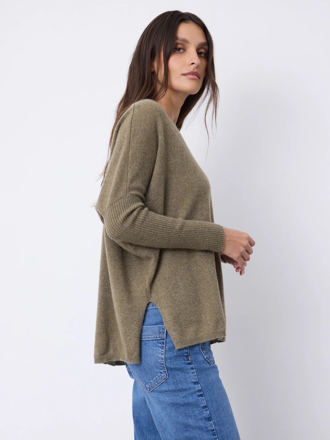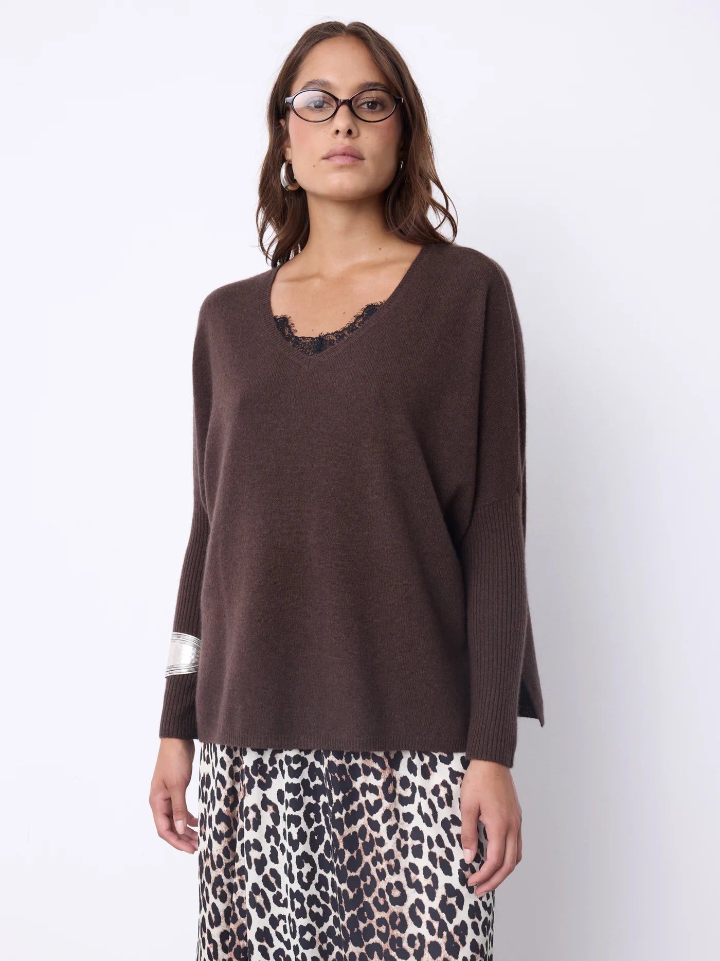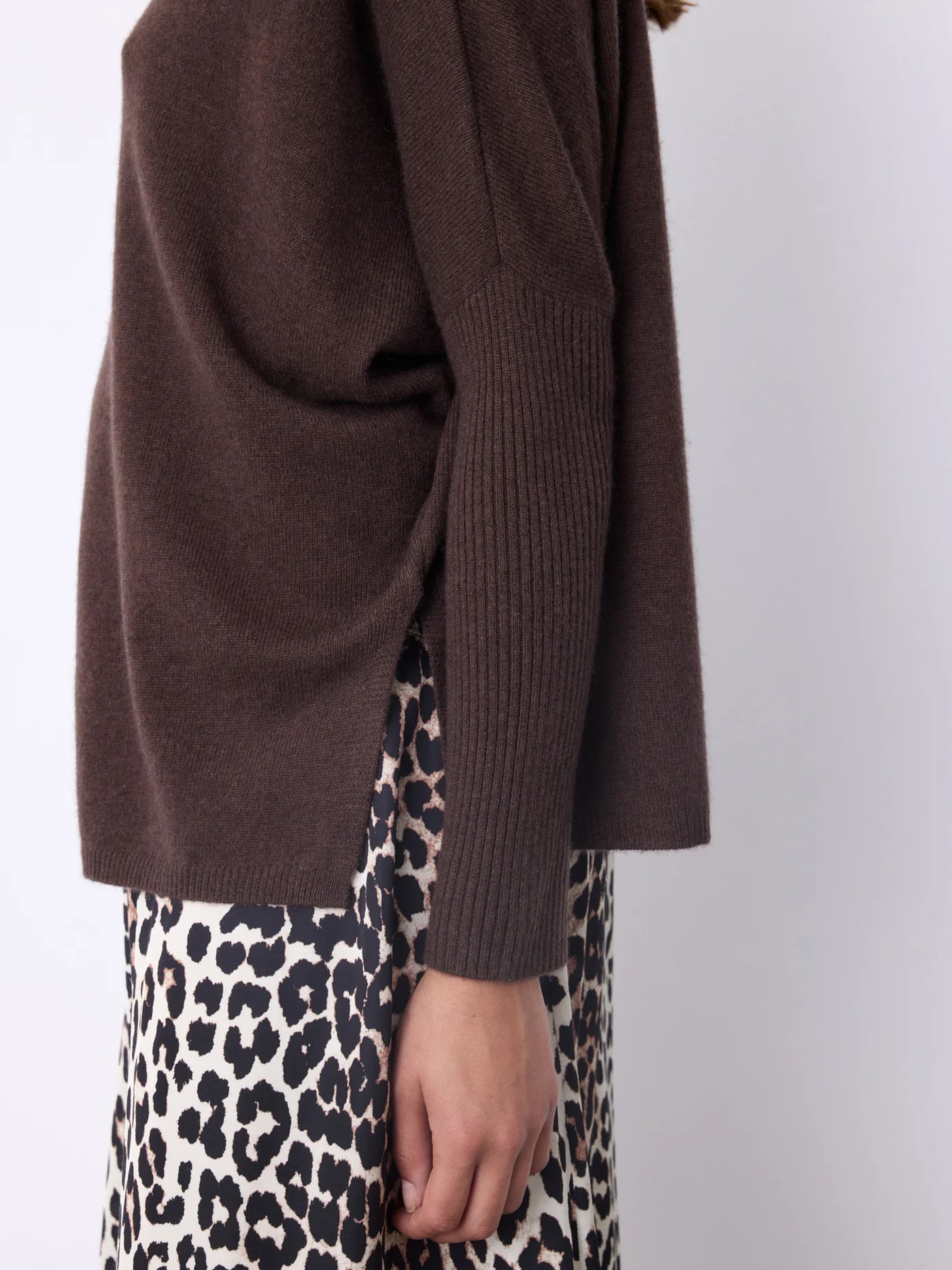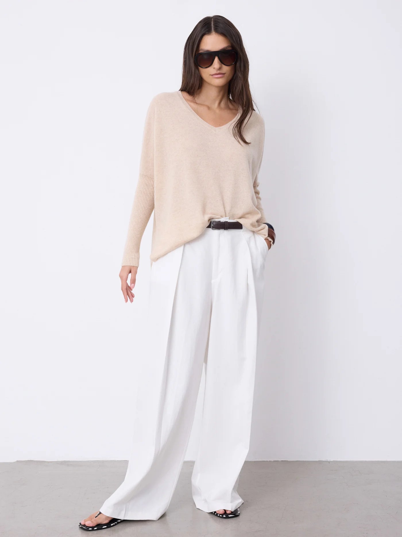 Pull pour femme à col V et manches longues chauve-souris, doté de manches côtelées, de fentes latérales et de finitions en bords-côtes, confectionné en cachemire 2 fils jauge 12, 100 % cachemire.