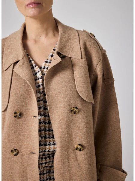 Trenchcoat court pour femme à manches longues, doté d’une fermeture à double boutonnage avec quatre boutons, de poches à l’avant, de pattes d’épaules et de poignets ceinturés, à la coupe droite, confectionné en 90 % laine et 10 % cachemire, jauge 12.